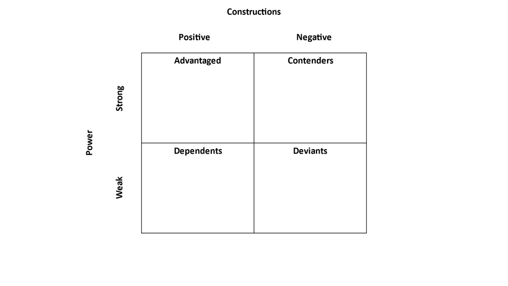 Schneider and Ingram created a typology (see Figure 1) to classify target populations by their positive or negative constructions and the strength and weakness of their power. Importantly, these categories are dynamic, meaning that while the construction or power of target populations is relatively sticky and consistent, these constructions can shift and change over time. A prominent example of these sticky, but shifting, constructions is the treatment of gay couples. Australian gay couples were targeted by policy makers with laws that constructed and criminalised their sexual relationships as deviant as late as the 1990s (the last state to repeal laws that made consensual sex between adult men illegal was Tasmania in 1997). Changing social attitudes and shifting constructions of lesbian, gay, bisexual and transsexual (LGBT) relationships have progressed to the point where more recent policy developments have legitimised LGBT relationships and legalised same-sex marriage in Australia. But the unusual choice not to legislate for this change in parliament, as per normal practice, and instead to conduct an expensive national plebiscite on the change, also reflected the stickiness of social constructions regarding homosexuality amongst politicians and a status quo reluctance to drive change from policy makers.43