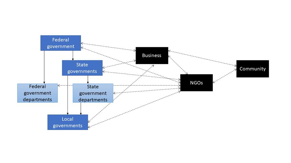 Under Type II MLG there is potential for multiple overlapping jurisdictions, as well as formal and informal collaborations between government and non-government actors. This form of MLG accounts for the influence of actors from markets, civil society and non-government organisations, and considers how governance might be structured by the informal and non-hierarchical interactions that occur beyond the structures of government.15 Type II MLG is more likely to be a temporary (or ongoing) collaboration for a particular policy or governance purpose.