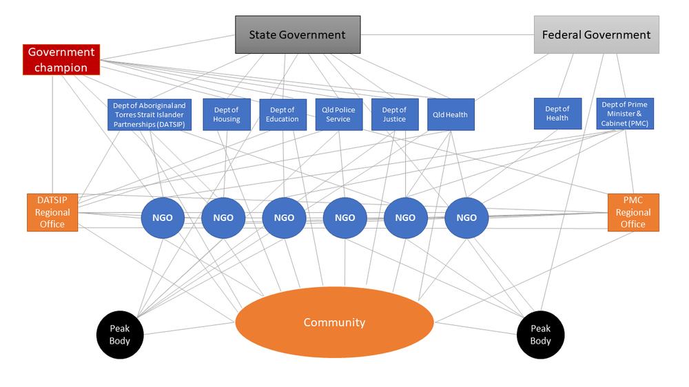MLG, as a method for allowing greater collaboration and policy coordination across both vertical and horizontal distributions of power, presents an opportunity for policy makers to increase genuine partnership, collaboration and deference of decision making to First Nations. Over 2016–17, the Queensland Productivity Commission conducted an inquiry into ‘service delivery in remote and discrete Aboriginal and Torres Strait Islander communities’ across 19 communities in Queensland. This inquiry identified a ‘bureaucratic maze’ of service delivery and funding schemes that obscured accountability, diminished community control and ultimately hampered policy outcomes despite over $1.2 billion in estimated funding for hundreds of initiatives servicing just over 40,000 people.21 The bureaucratic maze illustrated in Figure 2 demonstrates much of the difficulty for First Nations peoples to pursue their own policy goals and objectives, which may not measure wellbeing or success in the same terms or the same timelines as the government does.