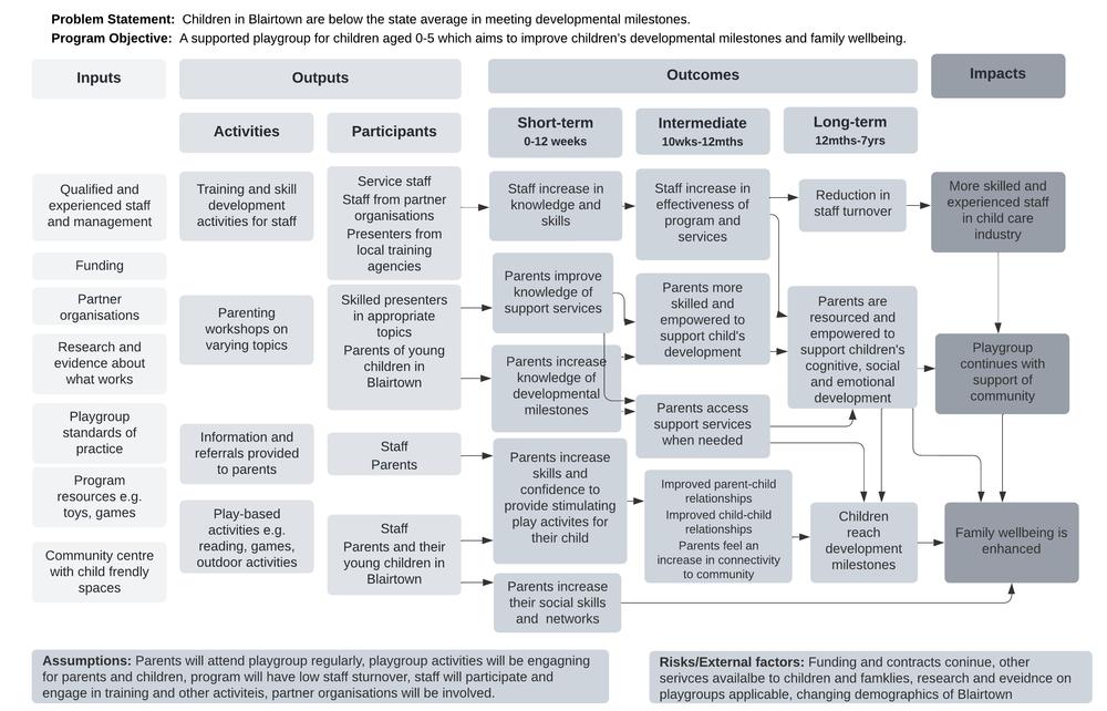 As can be seen in Figure 1, a logic model commences with a statement of the social problem as well as the intended objective of the program or policy. The diagram lists the inputs necessary for the program, and then outlines the causative pathways the program intends to support, moving from outputs (what is done and with/to whom) to a hierarchy of intended outcomes (what changes take place in both staff and participants), leading to the broader and longer-term impacts on the wider community over time. In this example the causal pathways form three ‘swimming lanes’, each leading to one or more impacts. In turn, the impacts form a hierarchy in which, working down, skilled and experienced staff are required to ensure the playgroup continues to operate leading to ongoing family wellbeing in the community. The model also identifies several assumptions upon which the program relies, as well as risks or external factors that might confront the program and inhibit the likelihood of achieving its stated objective. As such, a logic model provides a coherent explanation of how change is expected to occur within a policy or program.36 It creates a series of causal chains between outcomes, outputs and inputs. The success of this causal chain in the particular policy or program can be tested through process and outcome evaluations. The logic model also identifies the key elements of the policy or program that can be monitored during its implementation.