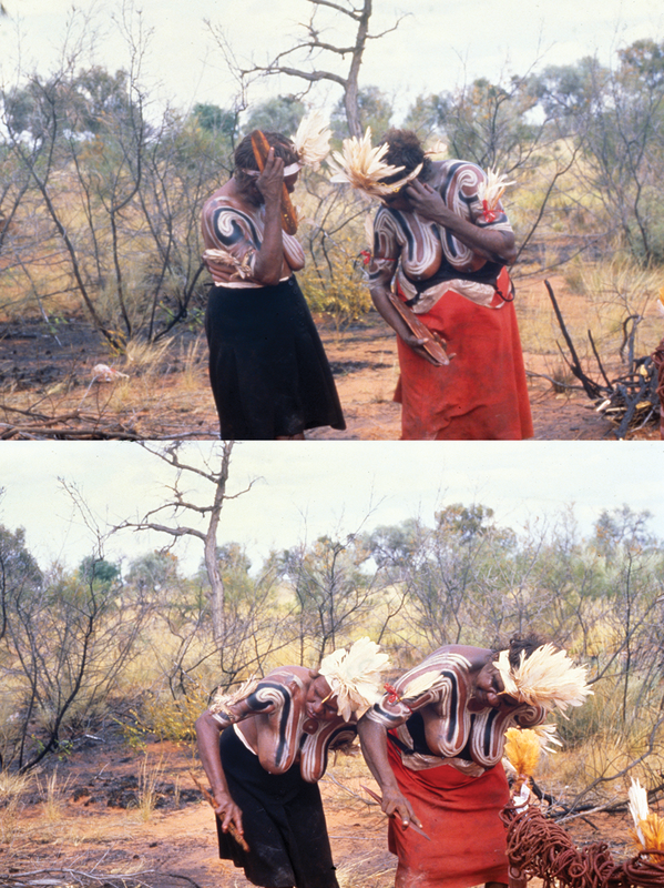 Figure 9.4 (Top) The father relentlessly sings the magical fire. (Bottom) The brothers see black smoke coming from the area where they live and worry about their father and try to run back to him. Photos by Françoise Dussart, 1983.