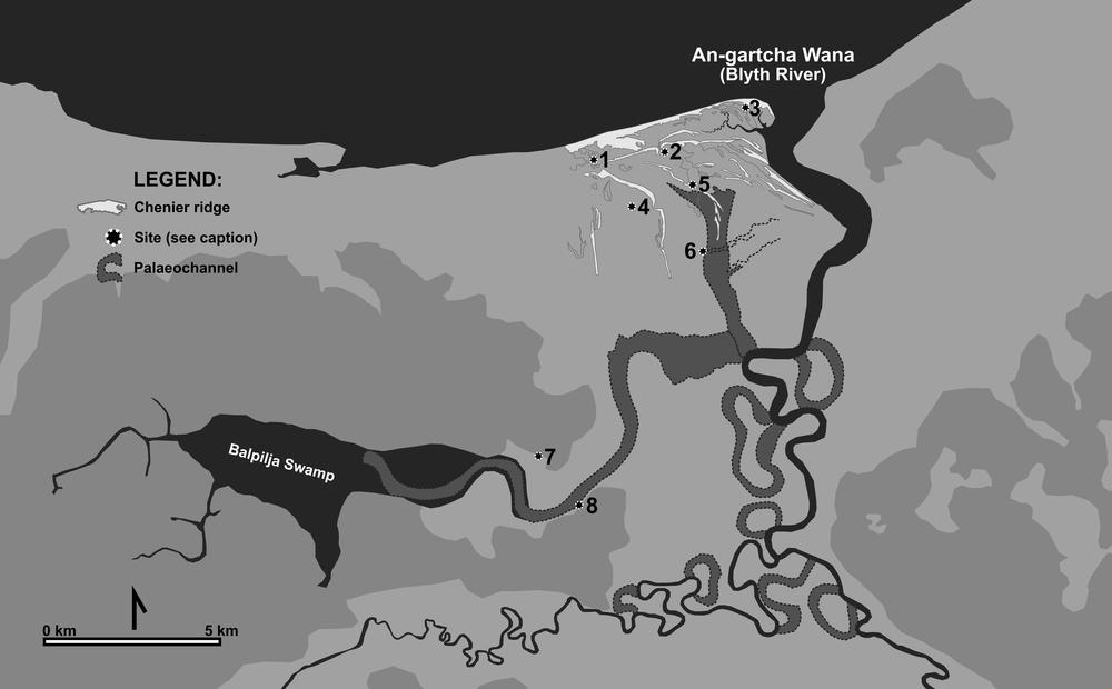 | Anamanba (8) | Blyth 1599 | Black swamp clay, over red-mottled clay, over light grey clay with organics | Charcoal | Eleocharis swamp at margin of Balpilja palaeochannel | 30–80 |