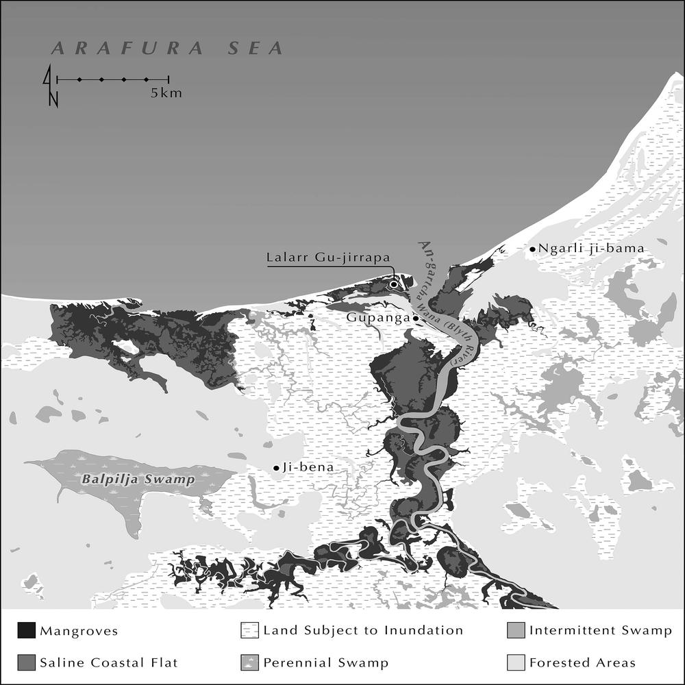 An-gartcha Wana is located on the coastal plains of northern Australia, 12 degrees south of the Equator in a subtropical savanna environment, in the “Top End” of the NT. The river rises in the Arnhem Land plateau to the south and flows into Boucaut Bay in the Arafura Sea. The study area is located 40 km east of the township of Maningrida in central Arnhem Land. It is bounded by the Arnhem Land escarpment to the south, the Arafura Sea to the north, the Liverpool River to the west and Cape Stewart to the east (Map 1.1, Figure 2.1; Meehan 1982a, 10–11).